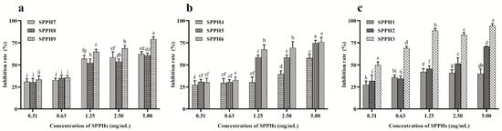 The proliferation inhibition of SPPHs on MGC-803 cells. (a) IR of SPPH7, SPPH8 and SPPH9; (b) IR of SPPH4, SPPH5 and SPPH6; (c) IR of SPPH1, SPPH2 and SPPH3. Each bar represents the mean ± standard of at least three separate experiments. All the data were analyzed by Duncan’s multiple comparisons; bars with no letter in common are significantly different at the level of p < 0.05.