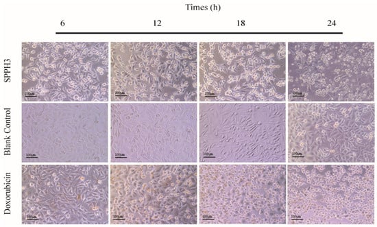 Phase contrast microscopy was used to visualize the morphological changes produced after treatment with SPPH3 or Doxorubicin or no treatment. As shown in Figure 3 (blank control group), the MGC-803 cells were spindle shaped, with clear cell outlines and smooth surfaces showing a high refractive index. With the extension of the incubation time (treated after 24 h), little protrusions of cells and more intracellular granules could be seen while growing into a dense monolayer with contact inhibition.