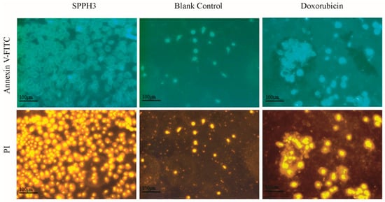 The treatment with SPPH3 or Doxorubicin resulted in an increase in floating cells, and cell debris was visibly apparent. Both Annexin V-FITC and PI staining and fluorescence microscopy were used to observe the cell membrane changes of the MGC-803 cells (Figure 4). Blank-control-treated cells remained little-stained because of intact cell membranes. The integrity of the cell membrane was destroyed while those cells were treated by SPPH3 and Doxorubicin. More cells were homogeneously stained and the shape of the cells was irregular. Moreover, Doxorubicin was superior to SPPH3. However, severe damage (such as cell death or cell apoptosis) led by Doxorubicin could be observed in the normal cells (data no shown). It was hypothesized that SPPH3 promoted the apoptosis of MGC-803 cells.