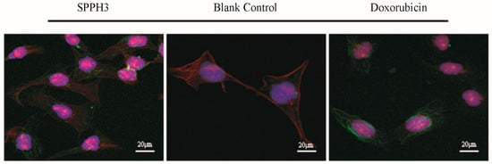 DAPI staining and immunofluorescence were used to observe the nuclear and cytoskeleton morphological changes of MGC-803 cells. As shown in Figure 5, blank control cells remained intact and homogeneously stained while those treated with SPPH3 or Doxorubicin showed nuclear fragmentation. Compared with the blank control group, the microtubules of cells treated with SPPH3 and Doxorubicin were stained and diffused inside and outside the cells. The disorganization of microtubules and obvious modification of bundle structures of actin could be observed. Moreover, nuclear fragmentation was found with a change of nuclear morphology (Figure 5). Consequently, the alteration of the actin filaments and microtubule was regarded as loss of the cell membrane integrity. Either SPPH3 or Doxorubicin play a role in the morphology changes of cytoskeleton.