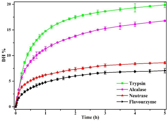 The DH of PP enzymolyzed by four enzymes (alcalase, neutrase, flavourzyme, and trypsin) using pH-stat method for 5 h.