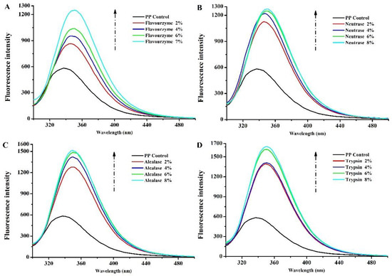 The intrinsic fluorescence of aromatic amino acid residues (Trp, Tyr, and Phe) is very sensitive to the microenvironment, and the emission fluorescence spectra of proteins are used to investigate the changes in their tertiary structure [27]. Therefore, the maximum fluorescence intensity and the wavelength (λmax) at the maximum fluorescence intensity are effective indicators to observe the structure and conformational changes in proteins [28]. Figure 2A–D show the fluorescence intensity of PP treated with flavourzyme, neutrase, alcalase, and trypsin, respectively. The intensities of the emission fluorescence of PP exhibited a maximum absorption at 337 nm. The λmax was affected by enzymatic treatment, and a shift in λmax to longer wavelengths (bathochromic shift) was observed for PP treated by flavourzyme enzymolysis (345.8, 345.4, 350.4, and 350.4 nm for 2%, 4%, 6%, and 7%, respectively), neutrase enzymolysis (346.8, 346.4, 350.2, and 350.4 nm for 2%, 4%, 6%, and 8%, respectively), alcalase enzymolysis (349, 349.6, 350.2, and 349.2 nm for 2%, 4%, 6%, and 8%, respectively), and trypsin enzymolysis (349.2, 350.4, 350.6, and 350.4 nm for 2%, 4%, 6%, and 8%, respectively). These results suggested that the microenvironment of chromophores in PP became more polar and hydrophilic after enzymatic treatment owing to the increased contact between the fluorophore and the aqueous medium [29]. In addition, the fluorescence intensity of PP after enzymatic hydrolysis increased significantly; the fluorescence intensity of all the four enzymes changed most significantly when DH increased from 0 to 2%. This indicated that the enzymatic hydrolysis process made more aromatic groups be exposed to solvent and more available to emit fluorescence [30,31]. With the increase in the DH, this process gradually slowed down. Among the four enzymes, trypsin-enzymolyzed PP had the highest fluorescence absorption peak. This indicated that trypsin changed the structure of PP most obviously.