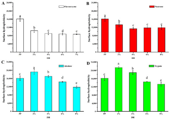 Surface hydrophobicity of PP and PP with different DH. The values reported represent means (n = 3) ± SDs and different superscript letters indicate significant difference (p < 0.05). ((A–D) are flavourzyme, neutrase, alcalase and trypsin treatment, respectively).