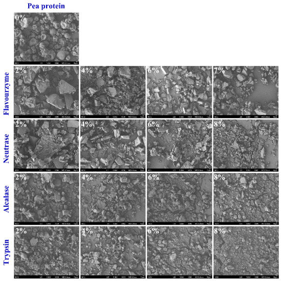 To gain insight into the effect of enzymatic hydrolysis on the change in the microstructure of PP, SEM micrographs were imaged for PP and PP with different DH samples. As shown in Figure 4, the natural PP is irregularly spherical with a smooth surface and a tight structure. After being treated with flavourzyme, neutrase, alcalase, and trypsin, the spherical structure of PP was broken into fragments. In addition, the microstructure of PP showed that the particles gradually became smaller with the increase in DH. The smaller particle size of PP made it have more chance to come into contact with water molecules during the dispersion process, thus changing the physicochemical properties of PP [29]. Furthermore, at the same DH, the protein particles treated by the four enzymes from small to large were trypsin, alcalase, neutrase, and flavourzyme, respectively. This result can correspond to the above result. The disruption of the protein microstructure may affect the amino acid groups embedded in the molecule and change the surface hydrophobicity, interaction forces, and secondary structure [37].
