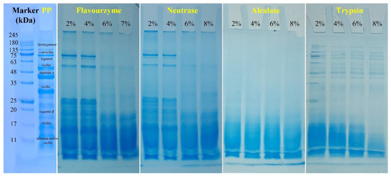 The molecular weight distribution was analyzed to investigate the effect of enzymatic hydrolysis on the PP. Figure 5 shows the SDS-PAGE electrophoresis of PP and PP with different DH samples. The electrophoresis pattern of PP showed multiple cleaned bands. The band at 17 kDa, 20–22 kDa, ~40 kDa, ~18 and ~50 kDa, ~60 kDa, ~75 kDa, and ~100 kDa could be attributed to 2S albumin polypeptides and/or γ-vicilin, legumin β, legumin α, vicilin, legumin, convicilin, and lipoxygenase, respectively [5]. After being treated with flavourzyme, neutrase, alcalase, and trypsin, the protein bands became progressively smaller as DH increased. Additionally, after enzymatic hydrolysis by flavourzyme and neutrase, the bands were clear at low DH (2% and 4%), but with the increase in DH, the protein bands were aggregated downward and the bands were gradually indistinguishable. After trypsin and alcalase treatment, the bands gradually moved toward the small molecules with the increase in DH, and the color of bands gradually became lighter, indicating that they kept aggregating toward the small molecule fragments after enzymatic hydrolysis. This result was consistent with the results of microstructure. It can also be shown that with the increase in DH, the molecular weight of PP gradually becomes smaller, which may affect the functional properties of PP. In addition, the effect of flavourzyme and neutrase on molecular weight of PP was lower than trypsin and alcalase under the same DH.
