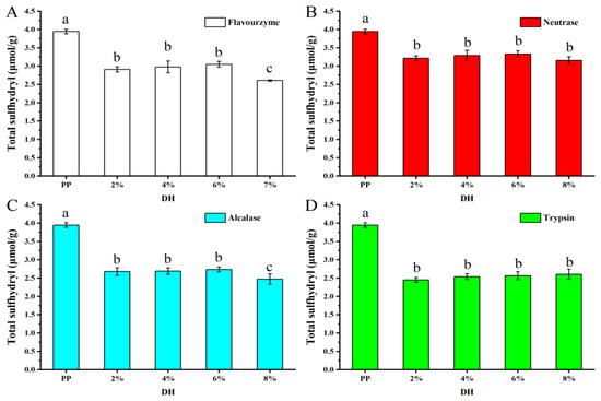 Total sulfhydryl content of PP and PP with different DH samples. The values reported represent means (n = 3) ± standard deviations and different superscript letters indicate significant difference (p < 0.05). ((A–D) are flavourzyme, neutrase, alcalase and trypsin treatment, respectively).