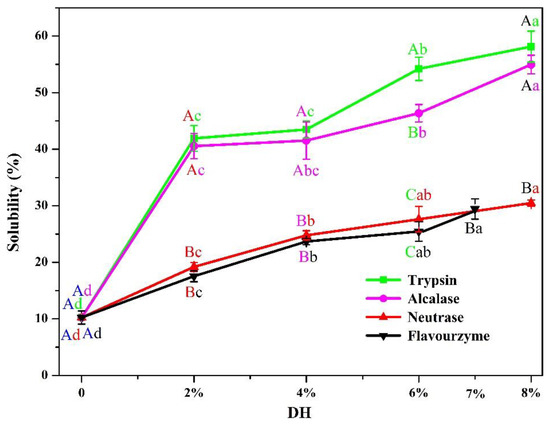 Solubility of PP and PP with different DH samples. Different lowercase letters are used to indicate the significant differences (p < 0.05) of the same enzyme under different DH, while different uppercase letters are used to indicate the significant differences (p < 0.05) of different enzymes under the same DH.