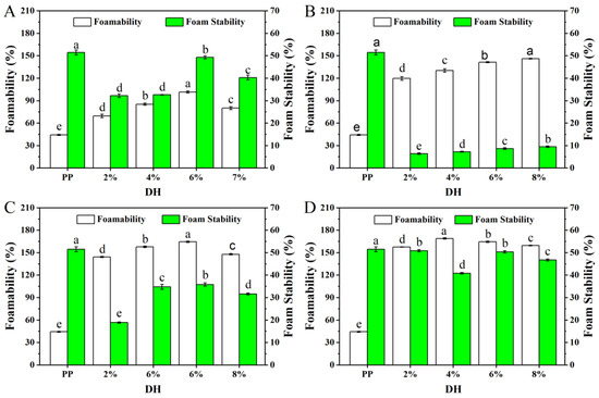 The foamability and foam stability of PP and PP with different DH samples ((A–D) are flavourzyme, neutrase, alcalase, and trypsin treatment, respectively). The values reported represent means (n = 3) ± SDs and different superscript letters indicate significant difference (p < 0.05).