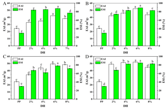 The EAI and ESI of PP and PP with different DH samples ((A–D) are flavourzyme, neutrase, alcalase, and trypsin treatment, respectively). The different superscript letters of same index indicate significant difference (p < 0.05).