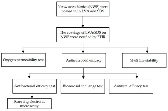 In order to coat nonwoven fabrics (NWF) with LVA plus SDS and determine the feasibility of the NWF + LVA/SDS with antimicrobial capabilities to be used in the food industry, two sets of experiments were performed. The first set of experiments addressed the coating procedure, verification of the coating, oxygen permeability, and shelf-life stability. Three concentrations of LVA plus SDS were coated on NWF coupons by a dip-coating method, and the coating was verified by Fourier transform infrared spectroscopy (FT-IR). An oxygen transmission rate test was carried out at 65% relative humidity and 21 °C to mimic the surroundings that the antimicrobial fabrics may encounter during the food processing conditions. Shelf-life stability was tested by the antibacterial effectiveness stored for up to 12 months under an ambient environment. The second set of experiments focused on the performance of antimicrobial functions of the coated fabrics in a worst-case scenario. The sandwich test and direct plating method were applied to determine the antibacterial efficacy of the samples. A bioaerosol of S. aureus was dispensed by an apparatus assembled in the lab, and the coated coupons were continuously challenged for 6 h. Antiviral efficacy test was performed using the TCID50 method. The detailed experimental design is shown in Figure 1.