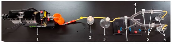 The LVA/SDS coated NWF was challenged with the bioaerosol of S. aureus based on ASTM F2101-19, “Standard Test Method for Evaluating the Bacterial Filtration Efficiency (BFE) of Medical Face Mask Materials, using a Biological Aerosol of Staphylococcus aureus” [24]. The apparatus for the bioaerosol dispenser was configured based on Demir, Cerkez, Worley, Broughton and Huang [15] with minor modifications as illustrated in Figure 2. After incubation at 37 °C for 18 h, 3 mL of S. aureus culture was suspended evenly in 300 mL of a 0.9% sterile saline solution (7.1 ± 0.1 log CFU/mL), in which an air compressor-connected nebulizer with a 0.22-µm filter in between was submerged for aerosol production. The NWF coated with or without LVA/SDS was cut into round coupons with a diameter of 3.70 cm (approximately 10.75 cm2) and respectively clamped into the parallel chambers of the Y-shape connecter in which the aerosolized bacteria were passing through. The air pressure was adjusted to 0.7–0.9 MPa through a pressure regulator mounted on the air compressor (E8L-550W, Eluan, Taizhou, China). The aerosolized bacteria were allowed to pass through the LVA/SDS-coated and control coupons for 6 h, and an average of 10 mL of the bacterial suspension was aerosolized. After a 6-h challenge, the air compressor was turned off and the system was set at a standstill for another 30 min. The coupons were then removed from the chambers and cell numbers were determined by spread plating serial dilutions (1:10 in 0.9% sterile saline solutions) onto plates as described above. The plates were incubated at 37 °C for 24 h before bacterial enumeration. The experiment was repeated three times.