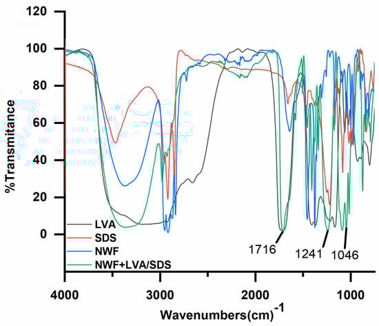 The coating efficiency of LVA and SDS into the NWF was confirmed by FT-IR characterization (Figure 3). The prominent peaks of LVA and SDS compounds in the FT-IR spectrum were at 1716 (C=O), and 1241 (S=O) and 1046 (O-SO3) cm−1, respectively. Compared to the spectra of NWF, the presence of these specific peaks of LVA and SDS in the LVA/SDS treated samples indicated that LVA and SDS were successfully coated on the NWF.