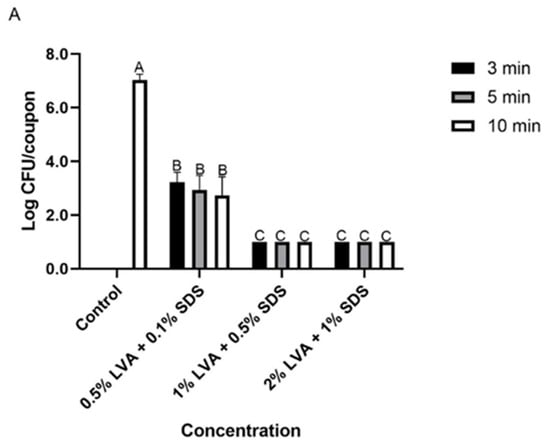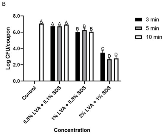 The antibacterial activity of LVA/SDS coated NWF was determined using the sandwich contact test. Generally, more cells were inactivated as the exposure times extended. For S. aureus, LVA/SDS-coated NWF showed superior antibacterial efficacy (Figure 4A). The bacterium recovered from the uncoated coupons was 7.0 ± 0.2 log CFU/coupon, while the fabrics loaded with 0.5% LVA + 0.1% SDS achieved >3.8-log CFU/coupon reduction at all the exposure times, and the bacterial counts were not recovered (<1.0 log CFU/coupon of the detection limit, > 6.0-log reduction) after 3-min contact time in the samples coated with higher concentrations (1% LVA + 0.5% SDS and 2% LVA + 1% SDS) of the combination. For E. coli, the bacterial population on the control coupons was determined as 7.1 ± 0.0 log CFU/coupon, and the cell counts (6.7–6.9 log CFU/coupon) of fabrics incorporated with low concentrations of the combination were not changed significantly (p > 0.05) after the contact times (Figure 4B). However, the coupons coated with medium and high concentrations of LVA and SDS achieved 1.1 and 3.6-log CFU/coupon reduction, respectively, after a treatment of 3 min. More than 4.3 log CFU of E. coli cells per coupon were decontaminated on 2% LVA + 1% SDS treated fabrics after a contact time of 5 and 10 min.