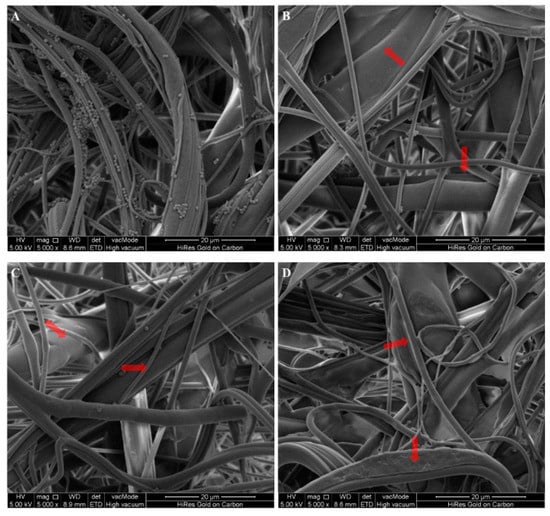 The antimicrobial efficacy of LVA/SDS-coated NWF against S. aureus and E. coli was also determined by SEM (Figure 5 and Figure 6). Microscopic images indicated that most of the cells in the meltdown polypropylene fabric matrix were detached after a 10-min contact with LVA/SDS-coated NWF. A greater number of both bacteria were removed when the treatment concentrations of LVA/SDS were increased. These images are consistent with the antibacterial assay and confirmed that the combination of LVA and SDS imparted antimicrobial properties to the NWF.