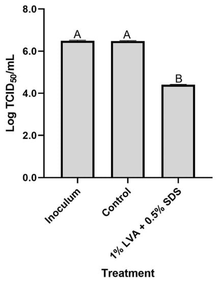 The antiviral activity of LVA/SDS-coated NWF was evaluated using the TCID50 method. As illustrated in Figure 7, virus recovered from the control coupons amounted to 6.48 ± 0.03 log TCID50/mL, with no significant (p > 0.05) difference from the inoculum (6.49 ± 0.03 log TCID50/mL). In contrast, fabrics coated with the binary combination exhibited a substantial reduction of 2.08 log TCID50/mL in the H1N1 virus, rendering >99% inactivation. These findings reveal the LVA/SDS-coated NWF is viricidal against the respiratory viral agent.