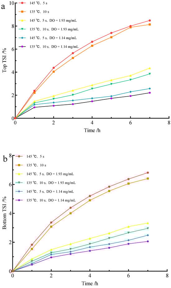 The TOTOX value is an evaluation of both primary and secondary oxidation products and is used to estimate the oxidative deterioration of food lipids []. As shown in Table 2, the most significant effect on TOTOX values was observed when DO = 1.14 mg/L (p < 0.05). This is because DO plays a major role in the hyperoxidative phase of lipids, the fatty acid radical reacts with DO to form a peroxide free radical []. Therefore, the reduction in DO content in milk can inhibit lipid oxidation in UHT milk. On the other hand, the TOTOX value in deoxygenated UHT milk rose as the sterilization condition rose. The effect of sterilization conditions on lipid oxidation was more significant than deoxygenation. Furthermore, this is a secondary reason why the top TSI was smaller in the low DO content of UHT milk, since the reduction in lipid oxidation positively affected the milk fat stabilizer [,,].
