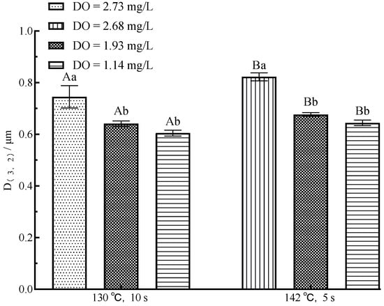 In addition to the effect of DO content variation in particle size, sterilization condition is also an important influencing factor. Under the same DO level, the particle size increased significantly with the increase in sterilization condition (p < 0.05), which was related to the increase in sterilization condition on accelerating fat floating and protein denaturation precipitation [].