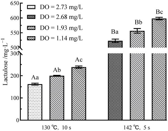 Lactulose is a disaccharide comprising fructose and forms due to an isomerization reaction of lactose during heating (>70 °C); it is also a participant in the early Maillard reaction []. According to Figure 4, under the same sterilization conditions, the lactulose content increased when the DO content decreased (p < 0.05). This is because the double bond of olefinic diol can be cleaved to form carboxylic acid under sufficient DO. The carboxylic acid will react with lactulose to form the early product of the Maillard reaction. Therefore, flash deoxidation treatment could remove DO to avoid the oxidative cleavage of the olefin diol, further preventing the consumption of lactulose []. However, the most critical factor affecting the lactulose content was the sterilization condition of the milk. Under higher sterilization conditions, the decrease in DO had no pronounced effect on the increase in lactulose content (p < 0.05).