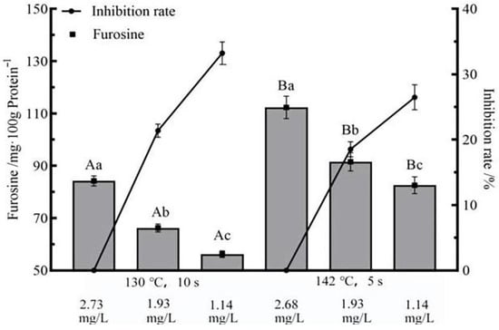 The content of furosine is further indicative of changes in the early extent of the Maillard reaction. It can be seen from Figure 5 that when the content of DO decreased, the content of furosine in the milk also decreased. When DO = 1.14 mg/L, the average of furosine inhibition rate in milk with two different UHT sterilization conditions was 33.23 ± 1.72% and 26.48 ± 1.92%, respectively. When DO = 1.93 mg/L, the average of furosine inhibition rate in milk with two different UHT sterilization conditions was 21.38 ± 1.01% and 18.53 ± 1.16%, respectively. These results indicated that the content of the formation of furosine mainly depended on the heat treatment conditions of milk and the content of DO. Carboxylic acid (from olefinic diol double bond cleavage) and lactulose combine to form lactuloselysine, which is further hydrolyzed to furosine. The cleavage of olefinic diol was inhibited in UHT milk with low DO content, which inhibited the formation of lactulose lysine, thereby reducing the content of furosine in UHT milk []. Additionally, PC is one of the key conditions for the formation of furosine. The PC in milk decreased when the content of DO decreased, resulting in a decrease in the content of dicarbonyl compounds, thus inhibiting the production of furosine []. According to the decrease in DO content, the content of furosine in milk decreased. This result indicated that the decrease in DO content had an inhibitory effect on the early Maillard reaction. At the same time, it also showed that the reduction in DO inhibited the thermal damage of UHT milk.