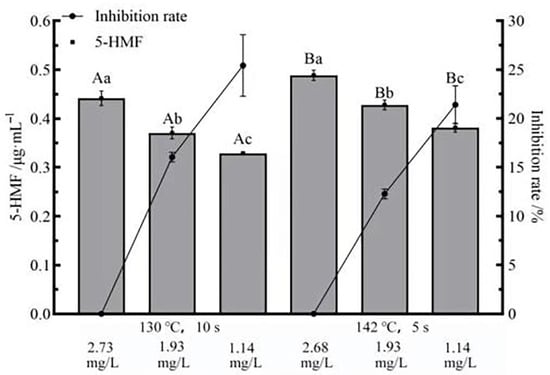 5-HMF can be used to indicate the intermediate stage of the Maillard reaction. Figure 6 shows the effect of different DO contents on 5-HMF at two sterilization conditions. The average content of 5-HMF in the two undeoxygenated UHT milk was 0.442 ± 0.014 μg/mL and 0.488 ± 0.010 μg/mL. When DO = 1.14 mg/L, the average content of 5-HMF in milk with two different UHT sterilization conditions was 0.329 ± 0.003 μg/mL and 0.382 ± 0.009 μg/mL, and the average of 5-HMF inhibition was 25.43 ± 3.14% and 21.41 ± 1.93%. When DO = 1.93 mg/L, the average content of 5-HMF in milk with two different UHT sterilization conditions was 0.384 ± 0.017 μg/mL and 0.407 ± 0.008 μg/mL, and the average of 5-HMF inhibition was 16.04 ± 0.49% and 12.29 ± 0.49%. 5-HMF concentration reduced with the decrease in DO concentration (p < 0.05). The decrease in 5-HMF content may have the following 3 reasons. (a) The reduction in DO content inhibited the degradation reaction rate of olefinic diols, thereby reducing the content of 5-HMF []. (b) Lower DO content inhibited the formation of 5-HMF by inhibiting the dicarbonyl compounds derived from the PC [,]. (c) A lower DO level prevented the oxidation of ascorbic acid from generating furfural compounds, inhibiting the formation of 5-HMF []. In addition, the increase in sterilization conditions promoted the formation of 5-HMF, which was consistent with the previous findings that the increase in heat treatment temperature promoted the formation of 5-HMF [].