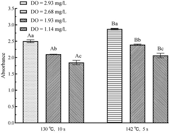 Melanoids are the final product of the Maillard reaction, and their absorbance change can be used as an indicator of the late Maillard reaction. Figure 7 showed the change in absorbance of melanoids in milk after flash deoxygenation. Regardless of the UHT sterilization conditions, the absorbance of deoxygenated UHT milk decreased significantly compared to that of un-deoxygenated samples (p < 0.05), indicating a decrease in melanoids content. The content of melanoids in UHT milk decreased significantly with decreasing DO content (p < 0.05). The inhibition of melanoids by the DO content is mainly related to lipid oxidation and inhibition of 5-HMF. DO oxidizes fatty acids (especially unsaturated fatty acids) to aldehydes and ketones, which subsequently combine with amino acids to form melanoids. In addition, the browning reaction of Amadori products was induced by the peroxidation product (lipid oxidation) to produce melanoids [,]. At the end of the Maillard reaction, 5-HMF polymerizes with aldehydes and ketones obtained from the melatonin reaction or lipid oxidation to further produce melanoids []. Therefore, a decrease in DO content inhibited the formation of 5-HMF and lipid oxidation, which in turn inhibited the formation of melanoids []. With the same DO content, the absorbance of UHT milk sterilized at 145 °C for 5 s was significantly greater (p < 0.05), indicating that the increase in sterilization condition led to an increase in the content of Melanoids in milk, which was consistent with the change in 5-HMF.