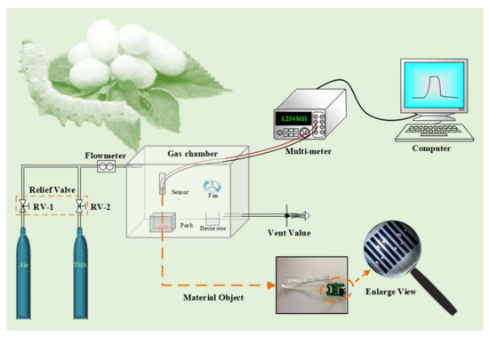 The testing system consisted of a computer, a multi-meter, a gas chamber, a desiccator, two gas cylinders and a sensor (as shown in Figure 1). The entire testing part, including the multi-meter and the sensor, was controlled by the computer. The computer issued instructions to the multi-meter and sensor to collect test data. The multi-meter was mainly used to gather the real-time resistances when samples were tested. In particular, the sensor was used for acquiring gas signals. It was composed of PANI/Ag/silk composites and flexible flat cable (FFC, 0.5 mm interval). PANI/Ag/silk composites were stuck in an FFC by silver-epoxy adhesives (as shown in Figure 1).