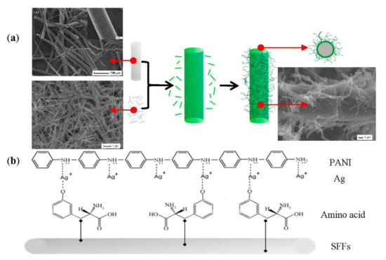 The synthesis principle of PANI/AgNWs/silk composites was illustrated in Figure 2. The tyrosine exposed to silk fibroin is considered as the redox active sites between the silk fibroin and silver ions at room temperature [33]. The Ag+ existed in AgNW solutions as adsorbed ions, so the compound effect of PANI and AgNWs can be achieved by static electricity adsorption and ion adsorption. The complexation between Ag+ with hydroxyl groups of tyrosine residue occurred on the SFFs backbone [34], which played a role as the reactive center to conjugate Ag+ and chains [35]. All of the above proved the silk to be a suitable substrate supporting the adhesion of PANI/AgNWs. The PANI/AgNWs and PANI/silk were intertwined and interlaced with each other forming a reticular structure, which strongly enhanced the electrical conductivity of the silk and provided more effective contact areas for gas.