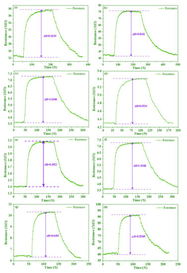 The performance of the PANI/AgNWs/silk sensor fabricated by polymerization times of 2 h, 4 h, 6 h and 8 h was shown in Figure 3e–h. The response value of composites polymerized for 4 h was much higher than that of composites polymerized for other times. The short reaction time of PANI combining with AgNWs caused a mutilated reticular structure. The bare PANI had a poor electrical conductivity leading to a low response value. While a long reaction time of PANI combined with AgNWs contributed to excessive PANI coating, this hindered trimethylamine from adsorbing composites and caused the response value to decrease as well. Therefore, 1.5 mL AgNWs and PANI polymerized for 4 h received the best response value when used for composites in the repeatability and stability test.