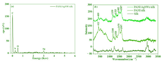 The research of energy dispersive spectroscopy was designed to further prove elements in PANI/AgNWs/silk composites. As shown in Figure 4a, the main elements, including carbon and oxygen, presented a relatively high peak, and they were the main compositions of silk. The characteristic peak of Ag element was also presented in the energy dispersive of spectra, which indicated the success of PANI/AgNWs/silk composites.