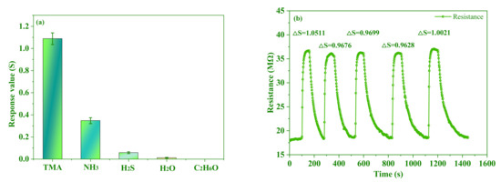 It is primarily important to increase the selectivity for the target gas. As shown in Figure 5a, the response values of the PANI/AgNWs/silk sensor towards 100 μg/L trimethylamine, ammonia (NH3), hydrogen sulfide (H2S), water (H2O) and ethanol (C2H6O) were measured according to Section 2.4.2. Every sample represented the average response values in triplicate, and error bars were estimated from three replicate tests. It was obviously found that the response towards trimethylamine is higher than that of other gases, which indicated that the PANI/AgNWs/silk sensor had a high selectivity for trimethylamine detection. The PANI/AgNWs/silk sensor is sensitive to nitrogen functional groups, so the PANI/AgNWs/silk sensor had a response to trimethylamine and ammonia. As shown in Figure 5b, the response of sensor was monitored towards 100 μg/L TMA for five cycles. The response and recovery times were estimated to be about 90 s and 110 s, respectively. It was observed that the resistance response of the sensor was retained after repeated cycles.