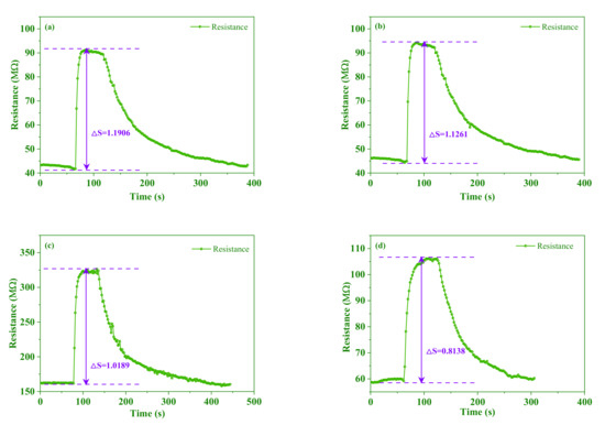 Figure 1 showed the dynamic responses of the sensor to TMA with a homemade test device. The sensor was placed into a gas chamber (1500 mL in volume) and used for testing resistances reflecting the concentration of TMA. Before testing, the chamber air needed to be changed with dry air for the final TMA test. The TMA gas flowed in the gas chamber from the cylinder at a rate of 2 L/min. The gas flow and direction were controlled by relief value. The resistance of the sensor was measured by a multi-meter (Agilent 34410A, Palo Alto, USA) at 2 s intervals. The resistances of the tested nanofibers were measured continuously in air (R0) and trimethylamine (Ri) to evaluate response values (S), as Equation (2) showed.