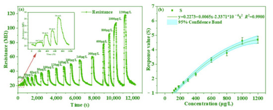 Figure 7a showed the response–recovery curves of the PANI/AgNWs/silk sensor to different concentrations of TMA ranging from 3.33 μg/L to 1200 μg/L. The sensor exhibited rapid response and recovery to TMA in different concentrations and was sensitive to TMA as small as 3.33 μg/L. Figure 7b showed the response values of the sensor as functions of TMA concentrations. The regression equation was y = 0.2273 + 0.0065x − 2.33711 × 10−6x2 (R2 = 0.9900) for the PANI/AgNWs/silk sensor (p < 0.05). The TVB-N content and its 95% confidence band were calculated in Figure 7b, which meant that the confidence band covered approximately 95% of the real effect. Compared with the informed research, the sensor showed the faster response, higher sensitivity and speedy recovery.