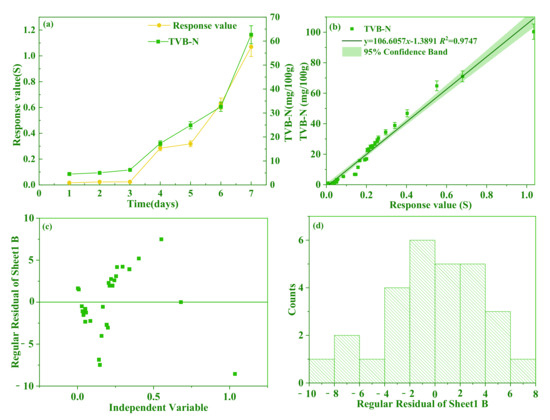 The changes of TVB-N and response value of the sensor to pork with storage time (a); the correlation between TVB-N contents to sensor response values (b); distribution diagram of regular residual (c); histogram of regular residuals (d).