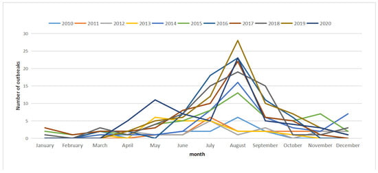 Year-month distribution of outbreaks of bacterial FBDOs in Zhejiang Province, 2010–2020.