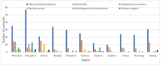 Region-etiology distribution of outbreaks of bacterial FBDOs in Zhejiang Province, 2010–2020.