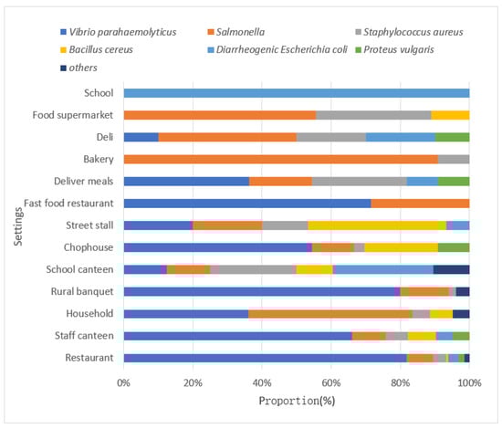 The settings of outbreaks caused by various pathogens were different (Figure 3). Vibrio parahaemolyticus outbreaks mainly occurred in restaurants (51.99%, 157/302), staff canteens (13.58%, 41/302) and rural banquets (13.25%, 40/302); Salmonella outbreaks mainly occurred in households (26.32%, 29/95), restaurants (15.79%, 15/95), and bakeries (10.53%, 10/95). For households, Salmonella (47.54%, 29/61) and Vibrio parahaemolyticus (36.07%, 22/61) both accounted for a high proportion of outbreaks. In addition, the main pathogens that occurred in fast food restaurants, bakeries and street stalls were Vibrio parahaemolyticus (71.43%, 10/14), Salmonella (90.91%, 10/11) and Bacillus cereus (40%, 6/15), respectively. Diarrheagenic Escherichia coli (29.17%, 14/48) and Staphylococcus aureus (25%, 12/48) were the main pathogens for outbreaks occurred in school canteens.