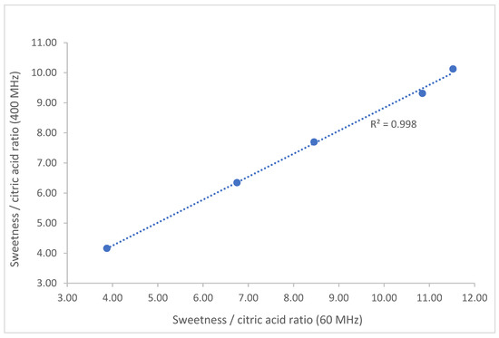 Correlation between the measurement of the sweetness/citric acid ratio of the samples obtained at 400 and 60 MHz.