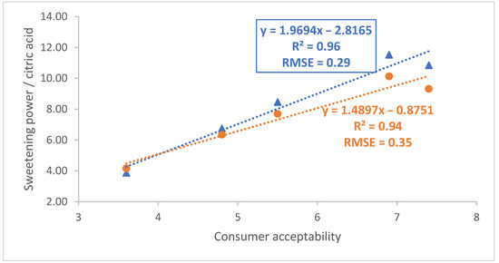 Correlation between consumer acceptability and sweetening power/citric acid determined using 60 and 400 MHz data (blue triangles and orange circles, respectively).