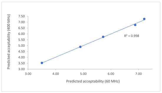 It is then possible to study the correlation between the acceptability of the mandarin samples determined by consumers and the sweetening power/citric acid ratio obtained using the 60 and 400 MHz systems (Figure 3). Using this set of data, a linear regression model with an R2 of 0.94 and an RMSE of 0.35 was obtained using data recorded at 400 MHz. The corresponding regression parameters of the linear model derived using sugar and citric acid concentrations determined with the 60 MHz instrument were 0.96 and 0.29, indicating that acceptability prediction models of similar quality were obtained regardless of the instrument employed in their development.
