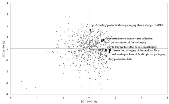 Biplot from the principal component analysis applied to the consumers’ behavior in relation to food packaging data (n = 646).