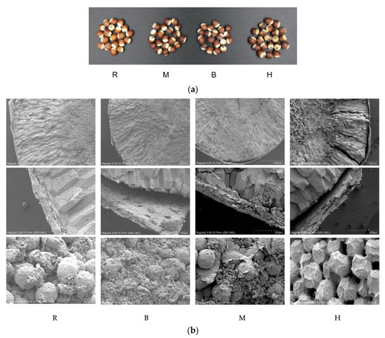 Surface morphology and microstructure of Euryale ferox seed (EFS). (a) Image of EFS after different thermal processing. (b) Scanning electron microscopy. R: Raw; M: Microwave; B: Baking; H: Industrial infrared heating-assisted fluidized bed (IHFH).