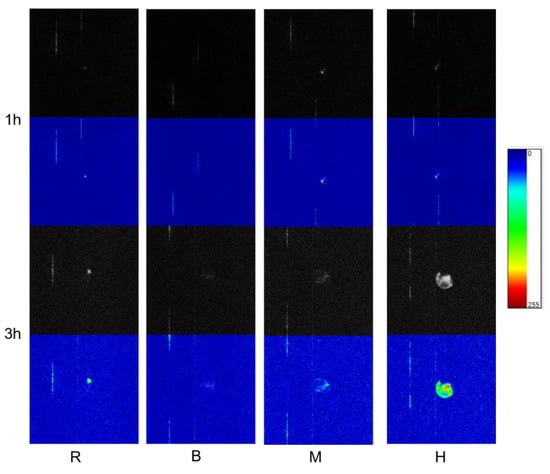 Low-field magnetic resonance imaging of EFS after different thermal processing. R: Raw; M: Microwave; B: Baking; H: Industrial infrared heating-assisted fluidized bed (IHFH).
