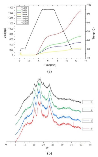 Physical-functional properties of roasted Euryale ferox seed (EFS) flour. (a) Viscosity curve of the raw, (b) X-ray diffraction pattern, and thermal processing EFS flours. R: Raw; M: Microwave; B: Baking; H: Industrial infrared heating-assisted fluidized bed (IHFH).