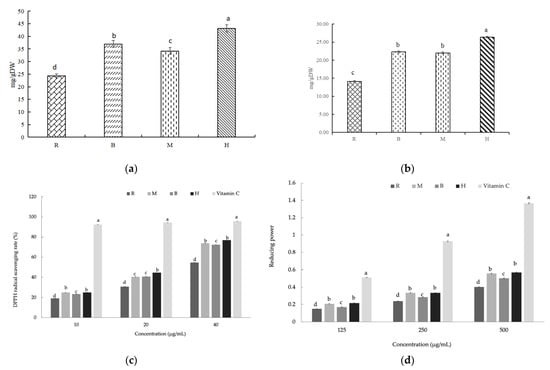 Functional components content and antioxidant activity of roasted Euryale ferox seed (EFS) flour. (a) Total phenolics content (TPC), (b) flavonoid content (TFC), (c) reducing power, and (d) DPPH free radical scavenging rate (%). R: Raw; M: Microwave; B: Baking; H: Industrial infrared heating-assisted fluidized bed (IHFH). Different lowercase letters represent significant differences (p < 0.05).