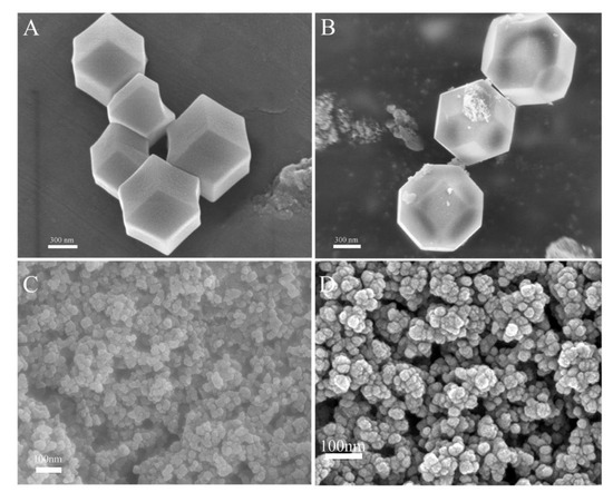 SEM images of Zn/Fe-ZIF (A), Zn/Fe-ZIF-NPC (B), NiHCF-NPs (C) and AuNPs (D).