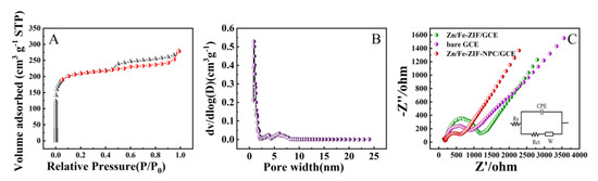 (A) N2 adsorption/desorption isotherms of Zn/Fe-ZIF-NPC, (B) Pore size distributions of Zn/Fe-ZIF-NPC, (C) EIS of bare GCE, Zn/Fe-ZIF/GCE and Zn/Fe-ZIF-NPC/GCE in 0.1 M KCl (containing 5 mM [Fe(CN)6]3−/4−). Zn/Fe-ZIF loading volume: 8 μL; Zn/Fe-ZIF-NPC loading volume: 8 μL.