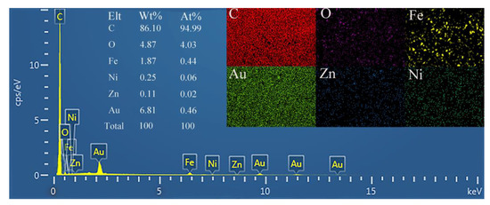 The elemental composition of the AuNPs/NiHCF-NPs/Zn/Fe-ZIF-NPC/GCE surface was determined by EDS. As displayed in Figure 3, Au, Ni, Fe, Zn, C and O elements were found on the AuNPs/NiHCF-NPs/Zn/Fe-ZIF-NPC/GCE surface, and these six elements were highly dispersed on the modified GCE’s surface, indicating that the modification materials were successfully immobilized on the GCE surface.