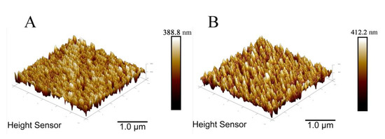 The surfaces of AuNPs/NiHCF-NPs/Zn/Fe-ZIF-NPC/GCE and Apt/AuNPs/NiHCF-NPs/Zn/Fe-NPC/GCE were observed by atomic force microscopy (AFM). As shown in Figure 4, the GCE surface became rougher after the bond of aptamer. The surface roughness was calculated from the AFM height images using root-mean-square value (RMS) and surface area difference. The surface height of AuNPs/NiHCF-NPs/Zn/Fe-ZIF-NPC/GCE was obtained as 388.8 nm with an RMS of approximately 33.26 nm, while the surface height of Apt/AuNPs/NiHCF-NPs/Zn/Fe-ZIF-NPC/GCE increased to 412.2 nm and the surface roughness increased to 50.37 nm, which indicates that aptamers were effectively immobilized on the AuNPs/NiHCF-NPs/Zn/Fe-ZIF-NPC/GCE surface.