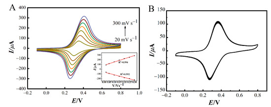 Moreover, the prepared AuNPs/NiHCF-NPs/Zn/Fe-ZIF-NPC/GCE were characterized using the CV technique. Firstly, the CV curves of AuNPs/NiHCF-NPs/Zn/Fe-ZIF-NPC/GCE at different scan rates were recorded. As shown in Figure 5A, higher current signals are obtained at higher scan rates and there is a good linear relationship between peak current and scan rate (inset of Figure 5A), corresponding to equations and . The above phenomena indicate that the electrochemical reaction that occurred on the GCE was an adsorption-controlled process. Then, the prepared AuNPs/NiHCF-NPs/Zn/Fe-ZIF-NPC/GCE were placed in 0.1 M PBS and 30 consecutive cyclic voltammetric scans were conducted. The results obtained are shown in Figure 5B. It can be noticed that the CV curves were stable and the peak current remained at 93% of the initial value after 30 cycles, demonstrating the good stability of the constructed modified GCEs.