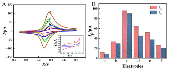 Firstly, the electrochemical behavior of different modified GCEs during the aptasensor preparation processes was investigated by CV in 0.1 M PBS (pH = 7.0). As shown in Figure 6A,B, no redox peak appeared on bare GCE (curve g). However, a pair of distinct redox peaks appeared on NiHCF-NPs/GCE (curve a) with the oxidation peak current (Ipa) and reduction peak current (Ipc) of 10.89 μA and 6.65 μA. This pair of redox peaks was caused by the electron transfer between Fe3+ and Fe2+ in NiHCF-NPs [32]. After modification with Zn/Fe-ZIF-NPC (curve b), the Ipa and Ipc on NiHCF-NPs/Zn/Fe-ZIF-NPC/GCE increased to 33.42 μA and 28.62 μA, respectively, which were significantly higher than those on NiHCF-NPs/GCE, indicating that Zn/Fe-ZIF-NPC effectively enhanced the sensing signal, which was attributed to the promotion of electron transport by Zn/Fe-ZIF-NPC. After electrodeposition on AuNPs (curve c), Ipa and Ipc increased significantly to 95.86 μA and 87.29 μA, indicating that Au also has excellent electrocatalytic activity for the redox of NiHCF-NPs. Compared with NiHCF-NPs/GCE, the Ipa and Ipc signals generated by the NiHCF-NPs probe were 8.8-fold and 13.1-fold greater under the synergistic effect of Zn/Fe-ZIF-NPC and AuNPs, which would greatly improve the sensitivity of PQ detection. When Apt was self-assembled on the modified GCE through Au-S bonding [33], the Ipa and Ipc of Apt/AuNPs/NiHCF-NPs/Zn/Fe-ZIF-NPC/GCE (curve d) decreased to 60.85 μA and 45.18 μA. After blocking the unbound active site on the modified GCE surface with MCH [34], the Ipa and Ipc further decreased (curve e). Finally, after incubation of MCH/Apt/AuNPs/NiHCF-NPs/Zn/Fe-ZIF-NPC/GCE with PQ (10 mg/L) for 60 min, the Ipa and Ipc decreased once again (curve f), which was due to the formation of the PQ-Apt complex on the modified GCE surface impeding the electron transfer at the sensing interface. The above results combined with those in Figure 4 indicate that the aptasensor was successfully fabricated.